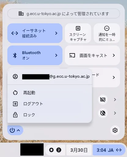 - 再起動により画面が映らないなどの不具合が起きる場合があります.対処法については「Chromebookを起動した際,ドックが認識されない問題(外付けディスプレイが映らない・キーボード等が認識されない)」を参照してください.