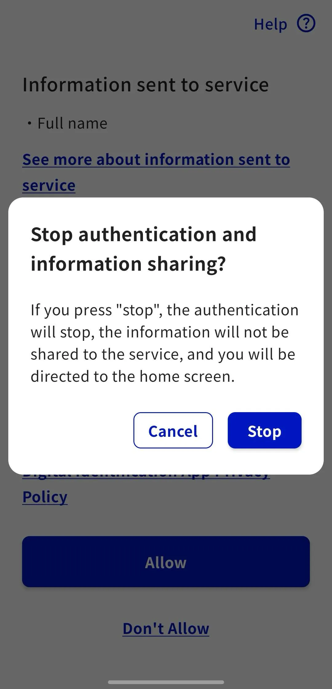 Although the format differs slightly between Android and iOS, a prompt will appear asking, “Stop authentication and information sharing?”.