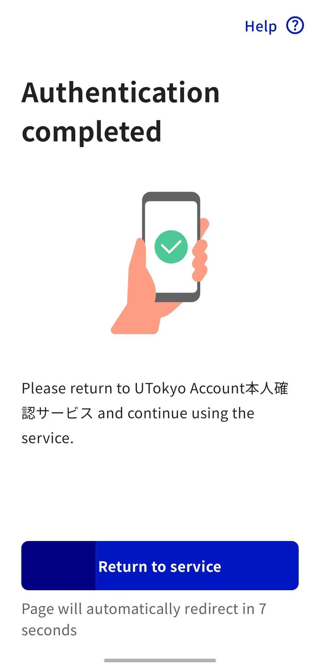 Tap “Return to the service in use” in the Digital Identification App or wait 10 seconds after the screen changes. You will be returned to the UTokyo Account Identity Verification Service.