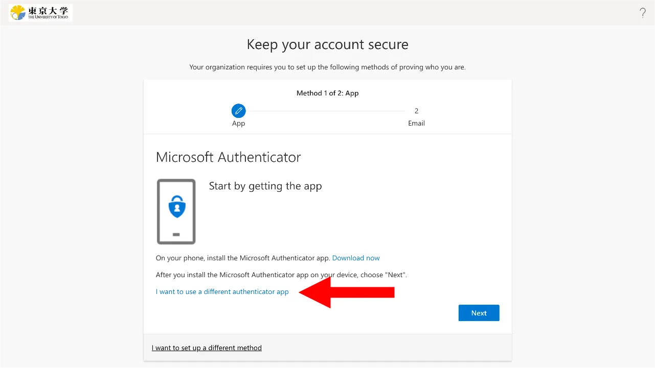 - Click “I want to use a different authentication app” in the middle of the setup page.